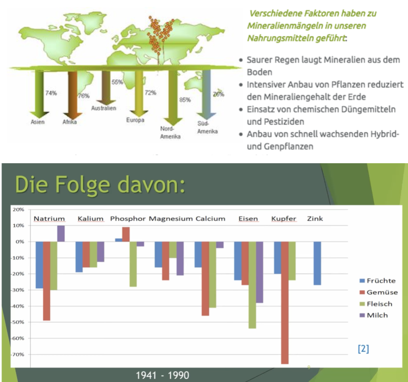 À chaque récolte, les plantes éliminent 60 à 70 minéraux et oligo-éléments de la couche arable. La fertilisation conventionnelle le remplace essentiellement par 3 éléments stimulant la croissance. (Nitrate, phosphore, potasse) Le calcium et occasionnellement le magnésium sont ensuite restitués au sol via un chaulage d'engrais. Le résultat est des cultures à haut rendement avec une infestation croissante de maladies et des aliments pauvres en nutriments vitaux. L'administration régulière (2t/ha) de poudre de pierre naturelle Provinea® associée à des cultures dérobées ciblées, du fumier ou du compost favorise la constitution d'humus et maintient la fertilité du sol. La diversité des oligoéléments est conservée. Ce faisant, vous créez la base d’une alimentation de haute qualité qui nourrit pleinement les humains et les animaux. (Fig. Earth Summit Report 1992 / -75% de perte de minéraux dans les couches d'humus terrestre au cours des 100 dernières années) / Diminution des éléments dans notre alimentation 1941 - 1990