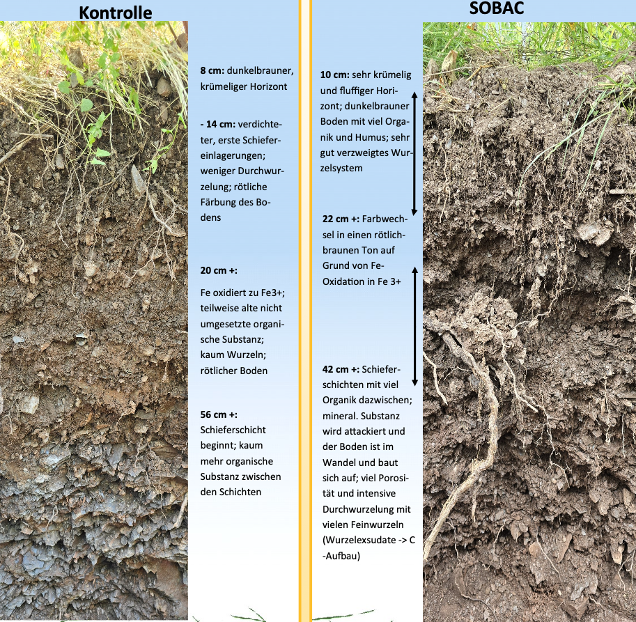 - Organische Substanz dringt tief in die Schieferschichten ein; mineralische Anteile werden „attackiert“ und umgebaut – der Boden lockert sich auf, Porosität und Krümelstruktur nehmen stark zu.