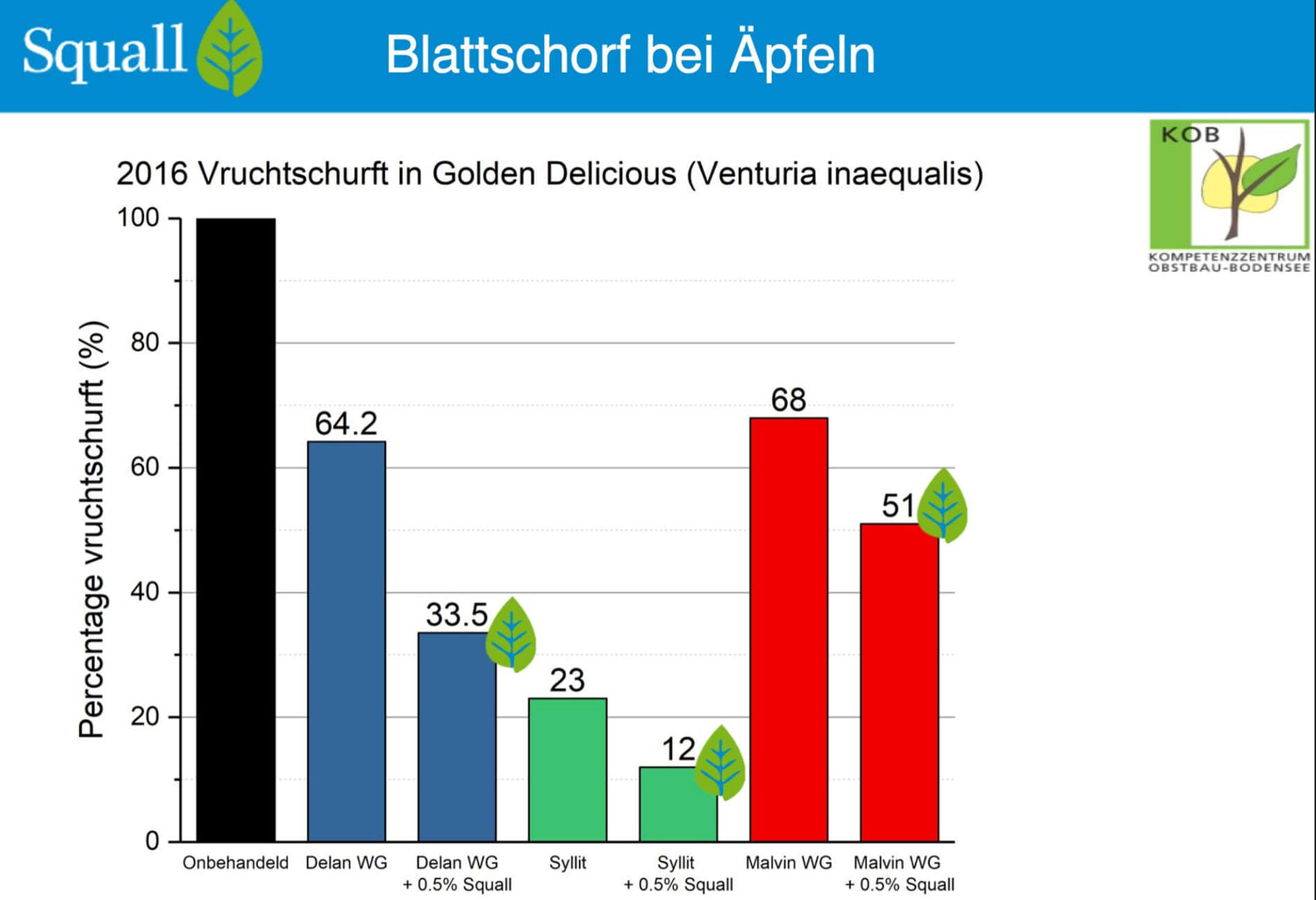 Untersuchungen im KOB am Bodensee mit Squall® zeigen eine deutlich verbesserte Wirksamkeit der angewendeten Fungizide. Die Daten belegen Eindrucksvoll wie mit Squall® sich die effiziens der angwendeten Fungizide erhöht. Untersuchungen zum Rückstandsverhalten mit Squall® belegen das mit Squall® sich das Rückstandsverhalten der angewendeten Mittel nicht verändert hat.