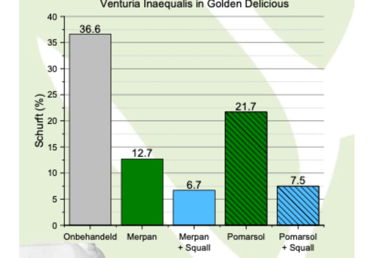 Untersuchungen zur Regenfestigkeit im belgischen (PC Fruit/Sin-Truiden) im Apfelanbau zeigen eindrucksvoll, dass Squall® die Wirkung von Kontaktfungiziden steigert. In der Simulation wurden die behandelten Pflanzen 25mm Niederschlag über eine Regendusche ausgesetzt. Die eingesetzten Kontaktfungizide zeigen eine um 80 % verbesserte Wirkung. Mit Squall® ist die Penetration in das Pflanzengewebe und die anschließende Regenfestigkeit deutlich besser.